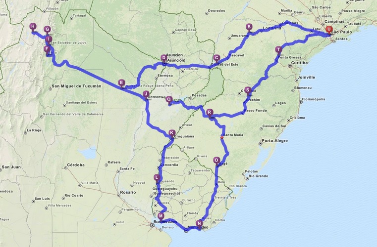 Mercosul 2007/8 - mapa do roteiro percorrido